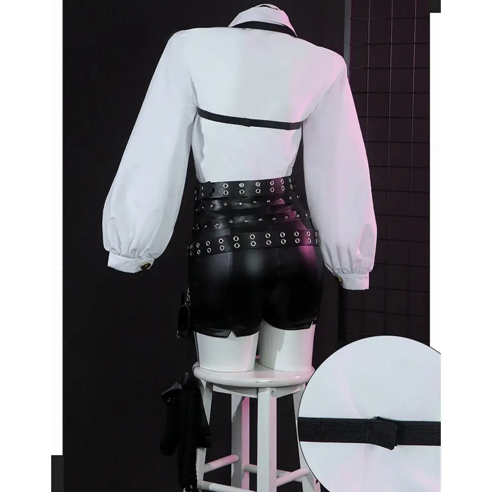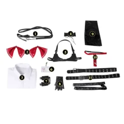 - Inhalt: Oberteil, Shorts, Kopfschmuck, Armband, Krawatte, Gürtel, Halskette, Peitsche